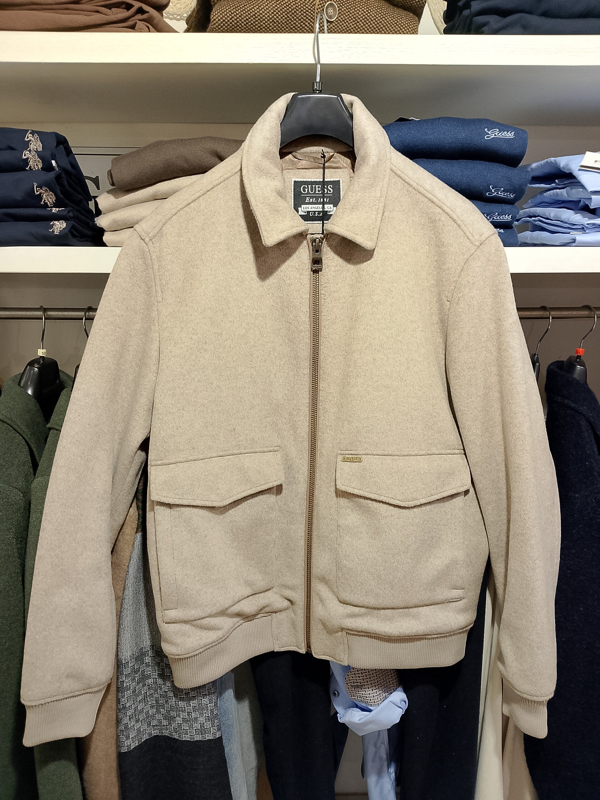 Bellissimo e caldo giubbotto beige chiaro in panno misto lana